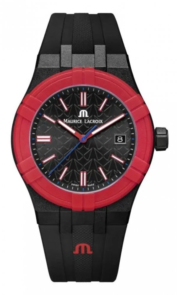Увековечивая историю #tide, эта новая модель снова сделана из переработанного пластика, связанного с океаном. Он оснащен черным циферблатом с соответствующим 40-миллиметровым корпусом. Безель выполнен в красном цвете, а черный резиновый ремешок имеет логотип Мориса Лакруа «M», также в ярком красном оттенке. Кроме того, часы поставляются со вторым ремешком, на этот раз из красной резины с черными акцентами. Оснащенный системой Easy Strap Exchange Maison, легко переключать один ремень на другой без необходимости использования инструментов.